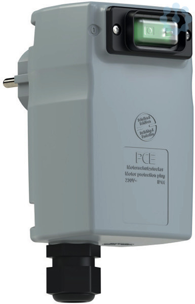 Motorschutzstecker 4A 230V IP44 (I-0) mit Kondensator 20μF; Gehäusematerial: PC/ABS; Nennstrom: 16A; Polzahl: 3 (2P+PE); Nennspannung/Frequenz: 230V~ / 50+60Hz; Kontakte: Messing vernickelt; Anschlusstechnik: Schraubklemmen; Schalter: AUS-EIN (0-I), Wippschalter beleuchtet; integrierter Kondensator 20μF, Kabelverschraubung M20; IK-Norm lt. EN50102: IK09; Schutzart: IP44