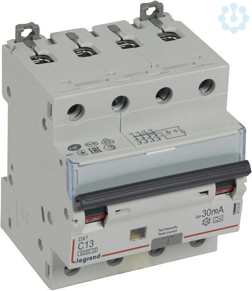 Legrand FI/LS-Schalter DX3, 4-polig, Typ A, für Wechsel- und pulsierende Gleichfehlerströme nach EN 61009-1, VDE 0664-20, unverzögert, Bemessungsstrom In 13 A, Bemessungsfehlerstrom Idn 30 mA.C-Charakteristik, Bemessungsspannung Un 400 VAC , Bemessungsfrequenz 50 Hz, Bemessungsschaltvermögen Icn 6 kA, Stoßstromfest bis 250 A, Energiebegrenzungsklasse 3, Auslöseanzeige: gelb=Fehlerstrom-oder Prüftastenauslösung, farblos= Kurzschluss-oder Handauslösung. Befestigung auf Hutprofilschiene EN 60715 durch rastende Schnellbefestigungen, klare Information vorne auf jedem Gerät, eindeutige Schaltstellungsanzeige rot/grün am Schalthebel (verriegelbar), mit Beschriftungsfenster, mit Untersteckschutz zum sicheren Einführen des Leiters in Fahrstuhlklemme, Anbau von Hilfsgeräten möglich.