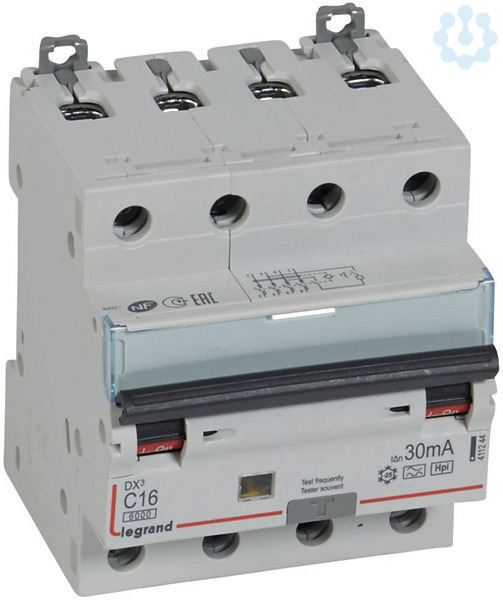 Legrand FI/LS-Schalter DX3, 4-polig, Typ F, Mischfrequenzsensitiv nach EN 62423, EN 61009-1, VDE 0664-20, kurzzeitverzögert, verzögert mindestens 10 ms, Bemessungsstrom In 16 A, Bemessungsfehlerstrom Idn 30 mA.C-Charakteristik, Bemessungsspannung Un 400 VAC , Bemessungsfrequenz 50 Hz, Bemessungsschaltvermögen Icn 6 kA, Stoßstromfest bis 3000 A, Energiebegrenzungsklasse 3, Auslöseanzeige: gelb=Fehlerstrom-oder Prüftastenauslösung, farblos= Kurzschluss-oder Handauslösung. Befestigung auf Hutprofilschiene EN 60715 durch rastende Schnellbefestigungen, klare Information vorne auf jedem Gerät, eindeutige Schaltstellungsanzeige rot/grün am Schalthebel (verriegelbar), mit Beschriftungsfenster, mit Untersteckschutz zum sicheren Einführen des Leiters in Fahrstuhlklemme, Anbau von Hilfsgeräten möglich.