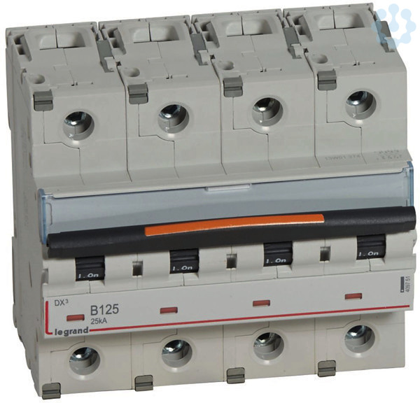 Legrand Leitungsschutzschalter DX3 nach EN 60947-2, 4-polig, B-Charakteristik, Bemessungsstrom In 125 A, Bemessungsschaltvermögen 25 kA nach EN 60947-2, Bemessungsspannung Un 400 VAC, Bemessungsfrequenz 50/60 Hz, Befestigung auf Hutprofilschiene EN 60715 durch zwei rastende Schnellbefestigungen, klare Information vorne auf jedem Gerät, eindeutige Schaltstellungsanzeige rot/grün, mit Beschriftungsfenster, mit Untersteckschutz zum sicheren Einführen des Leiters in Fahrstuhlklemme, Anbau von Hilfsgeräten möglich. Leitungsschutzschalter mit B-Charakteristik sind vornehmlich für den Leitungsschutz in Licht- und Steckdosen-Stromkreisen bestimmt.
