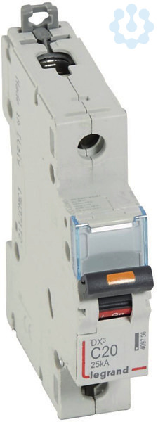 Legrand Leitungsschutzschalter DX3 nach EN 60947-2, 1-polig, C-Charakteristik, Bemessungsstrom In 20 A, Bemessungsschaltvermögen 25 kA nach EN 60947-2, Bemessungsspannung Un 230/400 VAC, Bemessungsfrequenz 50/60 Hz, Befestigung auf Hutprofilschiene EN 60715 durch zwei rastende Schnellbefestigungen, klare Information vorne auf jedem Gerät, eindeutige Schaltstellungsanzeige rot/grün, mit Beschriftungsfenster, mit Untersteckschutz zum sicheren Einführen des Leiters in Fahrstuhlklemme, Anbau von Hilfsgeräten möglich. Leitungsschutzschalter mit C-Charakteristik sind für den Leitungsschutz bei Geräten mit hohen Einschaltströmen (z.B. Motoren und Transformatoren) vorgesehen.