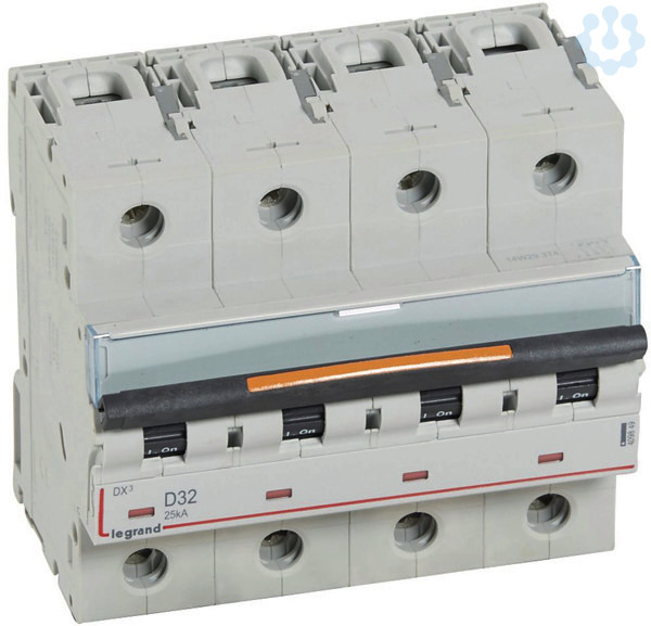Legrand Leitungsschutzschalter DX3 nach EN 60947-2, 4-polig, D-Charakteristik, Bemessungsstrom In 32 A, Bemessungsschaltvermögen 25 kA nach EN 60947-2, Bemessungsspannung Un 400 VAC, Bemessungsfrequenz 50/60 Hz, Befestigung auf Hutprofilschiene EN 60715 durch zwei rastende Schnellbefestigungen, klare Information vorne auf jedem Gerät, eindeutige Schaltstellungsanzeige rot/grün, mit Beschriftungsfenster, mit Untersteckschutz zum sicheren Einführen des Leiters in Fahrstuhlklemme, Anbau von Hilfsgeräten möglich. Leitungsschutzschalter mit D-Charakteristik sind für den Leitungsschutz in Kraftstromkreisen mit sehr hohen Einschaltströmen vorzusehen (z.B. Schweißtrafos).