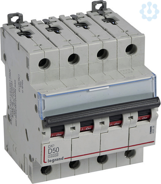 Legrand Leitungsschutzschalter DX3 nach EN 60947-2, 4-polig, D-Charakteristik, Bemessungsstrom In 50 A, Bemessungsschaltvermögen 10 kA nach EN 60898-1, Bemessungsspannung Un 400 VAC, Bemessungsfrequenz 50/60 Hz, Befestigung auf Hutprofilschiene EN 60715 durch zwei rastende Schnellbefestigungen, klare Information vorne auf jedem Gerät, eindeutige Schaltstellungsanzeige rot/grün, mit Beschriftungsfenster, mit Untersteckschutz zum sicheren Einführen des Leiters in Fahrstuhlklemme, Anbau von Hilfsgeräten möglich. Leitungsschutzschalter mit D-Charakteristik sind für den Leitungsschutz in Kraftstromkreisen mit sehr hohen Einschaltströmen vorzusehen (z.B. Schweißtrafos).