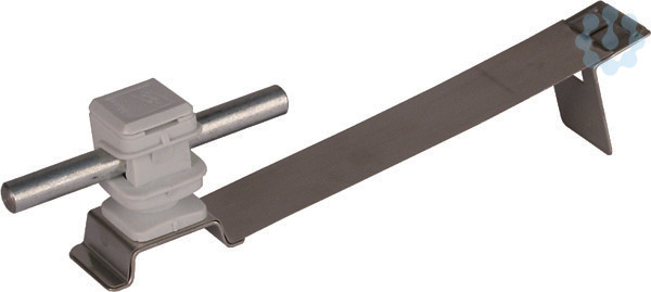 Dachleitungshalter FLEXIsnap mit gewinkelter flexibler Grundstrebe zur Befestigung von Fang- und Ableitungen für Dachflächen. Ausführung mit flexibler Grundstrebe aus dünnem NIRO (0,3 mm), zum Anformen an die Falze der Dachziegel / Dachsteine, mit Leitungshalter DEHNsnap Bauhöhe 16 mm, lose Leitungsführung, aus wetterbeständigem Kunststoff, UV-stabilisiert und halogenfrei.
