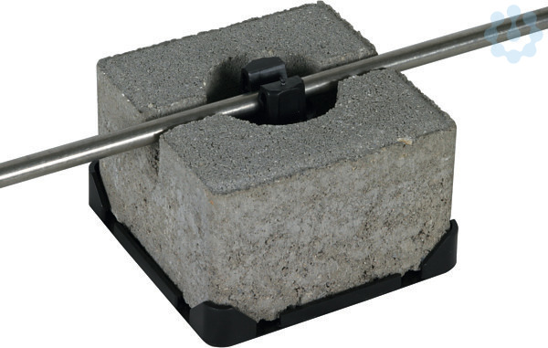 Dachleitungshalter mit einfacher Leitungshalterung Typ FB, zur Befestigung von Rundleitern oder Bändern (mit Adapter) mit loser Leitungsführung auf Flachdächern. Ausführung zweiteilig aus Leitungshalter mit Grundplatte aus wetterbeständigem Kunststoff, UV-stabilisiert und halogenfrei, mitaufgerastetem Stein aus frostbeständigem Beton. Stein und Unterteil getrennt recycelbar.