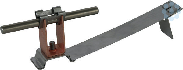 Dachleitungshalter FLEXIgrip mit gewinkelter flexibler Grundstrebe zur Befestigung von Fang- und Ableitungen für Dachflächen. Ausführung mit flexibler Grundstrebe aus dünnem NIRO (0,3 mm), zum Anformen an die Falze der Dachziegel / Dachsteine, mit Leitungshalter DEHNgrip, lose Leitungsführung.