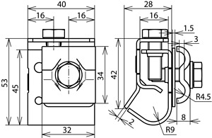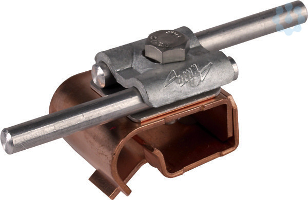 Dachrinnenklemme nach DIN EN 62561-1, zum Verbinden von Rundleitern dem Wulst der Dachrinne. Ausführung Zweimetall für Dachrinnen Cu mit Doppelüberleger (St/tZn) und Zwischenplatte.