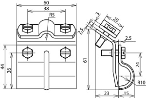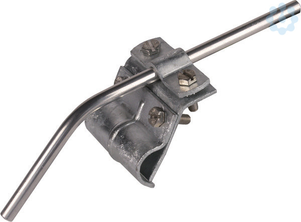 Dachrinnenklemme nach DIN EN 62561-1, zum Verbinden von Rundleitern dem Wulst der Dachrinne. Ausführung mit Zweischrauben-Überleger, Baubreite 60 mm.