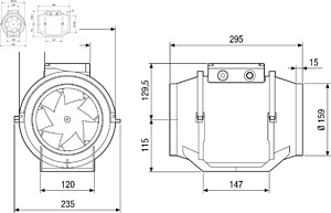 Besondere Eigenschaften: Hocheffizienter Rohrventilator, aus hochwertigem Kunststoff (PP) gefertigt. Einsetzbar für Industrie- und Wohnbauinstallationen. Mit Integrierter Montagkonsole für schnelle und einfache Ventilatorbefestigung. Druckstarkes Diagonal-Laufrad mit nachgeschaltetem Stator für hohe Luftleistung. Strömungstechnisch und akustisch optimierte modulare Bauweise führt zu hoher Laufruhe. Geringer Platzbedarf durch kompakte Abmessungen. Für direkten Einbau zwischen Rohrleitungen, je nach Einbaulage für Be- oder Entlüftung. Druck-und saugseitige Anschluss-Stutzen entsprechend den gängigen Norm-Rohrdurchmessern. Schnelle einfache Revision und Wartung des Ventilators durch Öffnen der Spannbügel. Schutzart IP 44. AC-Motor: Drehzahlsteuerbar 3-stufig, optional drehzahlsteuerbar mittels Phasenanschnitt oder Transformator möglich. Thermischer Überlastungsschutz serienmäßig. Elektrischer Anschluss über am Gehäuse integrierten Klemmkasten. Robuster Motor mit Feuchteschutz und Kugellager, wartungsfrei. Thermische Klasse 130 (B). Montagehinweise: Einbau in jeder Lage möglich. Elektrischer Anschluss: Außenliegender Klemmenkasten mit Kabeleinführungstülle. Sicherheitshinweise: Ventilator bei freier Ansaugung oder freier Ausblasung nur in Betrieb nehmen, wenn der Berührungsschutz des Flügelrades gemäß DIN EN ISO 13857 gewährleistet ist. Dazu optionales Schutzgitter SGR anbringen.Artikel: HDR 16, Fördervolumen: 684 m3/h, Drehzahl: 2834 1/min, Laufradtyp: diagonal, Drehzahlsteuerbar: ja, Reversierbarkeit: nein, Spannungsart: Wechselstrom, Bemessungsspannung: 230 V, Netzfrequenz: 50 Hz, Nennleistung: 55,4 W / im opt. Wirkungsgrad, INenn: 0,22 A / im opt. Wirkungsgrad, IMax: 0,23 A, Schutzart: IP 44, Wärmeklasse: B, Einbaulage: senkrecht / waagerecht, Material: Kunststoff PP, Material Gehäuse: Polypropylen, Farbe: grau, Gewicht: 2,77 kg, Gewicht mit Verpackung: 3,28 kg, Nennweite: 160 mm, Breite: 235 mm, Höhe: 244,5 mm, Tiefe: 295 mm, Breite mit Verpackung: 255 mm, Höhe mit Verpackung: 245 mm, Tiefe mit Verpackung: 310 mm, Fördermitteltemperatur bei IMax: 50 °C, Gleichstrommotor: false, Max. Drehzahl: 2834 1/min