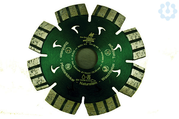 Lasergeschweißte Diamant - Trennscheibe PREMIUM zum Einsatz in Granit, Naturstein, Waschbeton, Plaster, Kalksandstein, Ziegel und Mauerwerk. Die lasergeschweißten Segmente haben eine Ausprägung von 12 Millimetern