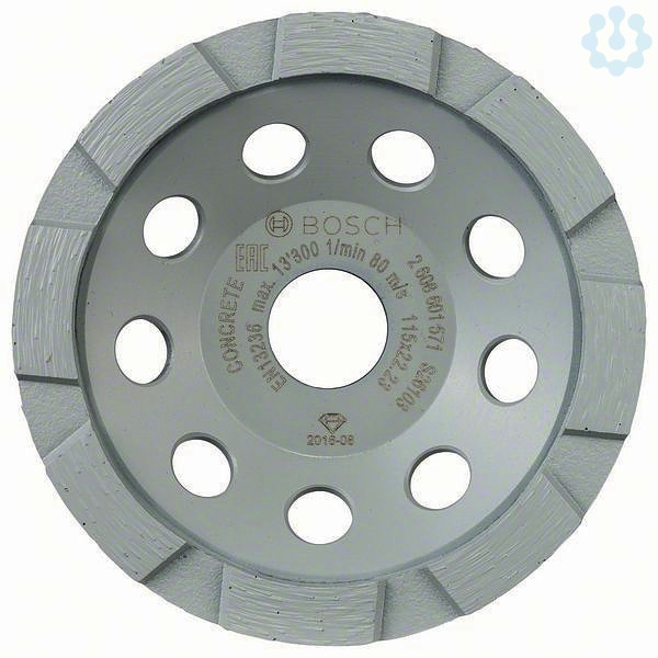 Diamanttopfscheibe Standard for Concrete für Betonschleifer. Durchmesser: 115 mm, Bohrungsdurchmesser: 22,23 mm, Segmenthöhe: 3 mm. Ideal zum raschen Abschleifen dicker Betonschichten. Das Schruppen von Beton ist kein Problem mehr. Die optimale Lösung für den professionellen Anwender. Geeignet für das Abschleifen dicker Betonschichten. Segmente gesintert. Eine Segmentreihe. Maximale Unwucht 50 g/mm für vibrationsfreies Arbeiten.