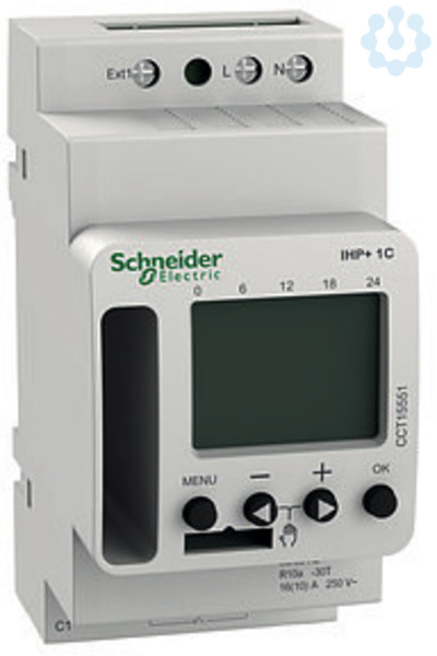 Digitale Zeitschaltuhr mit Wochenprogramm. Die Programmierung erfolgt am Gerät oder über die Smartphone App Acti 9 Light and Time Switch via Bluetooth Stick. Der Bluetooth Stick wird auch als Speicherkarte verwendet. Programmierbar auch über PC mittels Programmierkit CCT15860. Externer Eingang pro Kanal als Nebenstelle. Kurzanleitung im Aufbewahrungsfach. Für die Montage auf Hutschienen TH35. nach EN 60715. Funktionen -84 Speicherplätze. Speicherkarte. EIN-AUS Schaltzeiten. Impulsprogramm. Zyklusprogramm. Schaltungsvorwahl. Ferienprogramm -Integrierter Betriebsstundenzähler (Rückstellmöglichkeit, Servicefunktion zur Überwachung von Wartungsintervallen). 2 Zufallsprogramme. Displaybeleuchtung (abschaltbar). Sommer-/Winterzeitumschaltung -Automatisch, deaktivierbar, Umschaltregeln für Europa, USA und weitere Länder sind bereits hinterlegt, eigene Umschaltregel oder Umschaltung nach fixem Datum wählbar. PIN-Codierung. Nennspannung AC 230,-15 %/+10 %, 50/60 Hz. Schaltleistung max 16 A, AC 250 V, cos phi1, 10 A, AC 250 V, cos phi0,6. Schaltleistung min 10 mA, AC 230 V, 100 mA, AC/DC 12 V. Kontakt potentialfrei. Standby-Leistung < 0,5 W. Glühlampenlast 2600 W. Halogenlampenlast 2600 W. Leuchtstofflampenlast nicht kompensiert 2600 VA, reihenkompensiert 2600 VA, -parallel-kompensiert 400 VA (48 uF). Kompaktleuchtstofflampen 400 W. LED <2 W 25 W. LED >2 W 200 W. Kürzeste Schaltzeit 1 s. Externe Eingänge 1 pro Kanal. Anschlüsse Schraubklemmen, starr/flexibel 2x0,5 - 2,5 mm2, mit Aderendhülse max. 1x2,5 mm2. Bedienelemente 4 Tasten zur Menüführung. Ganggenauigkeit 7+/-0,25 s/Tag (25 GradC). Gangreserve10 Jahre. Schutzart IP 20. Gerätebreite 2,5 TE ca. 45 mm.