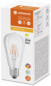 Dimmbare LED-Lampen, klassische Edison-Kolbenform. Produkteigenschaften: LED-Lampen für Netzspannung. Ausstrahlungswinkel: bis zu 300°. Dimmbar. Farbwiedergabeindex Ra: ≥ 90. Produktvorteile: Lampen mit innovativer LED-"Filament"-Technologie. Natürliches Lichtspektrum mit hervorragender Farbwiedergabe von CRI > 90. Stark reduzierter Blauanteil. Verbesserter Sehkomfort und geringere Augenbelastung. Sehr geringer Energieverbrauch. Sofort 100 % Licht, keine Aufwärmzeit. Geringes flackern. Anwendungsgebiete: Ideal für dekorative Einbauten. Anwendungen im Haushalt. Allgemeinbeleuchtung. Einsatz im Außenbereich nur in geeigneten Außenleuchten.
