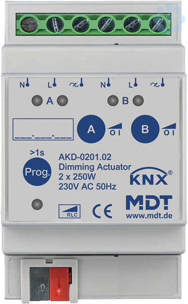 KNX Dimmaktor 2-fach, 3TE REG, 250 W, 230 V AC mit Wirkleistungsmessung. Optimiert für dimmbare LED Leuchten (ab 2 W). Für HV-Halogenlampen und NV-Halogenlampen mit Trafo/EVG. Betrieb im Phasenanschnitt oder Phasenabschnitt einstellbar. Messung der aktuellen Wirkleistung. Integrierte Diagnosefunktion mit Klartextmeldung. Überlast-/Kurzschluss- und Temperaturschutz mit Alarmmeldung. Zeitfunktionen (Ein-/Ausschaltverzögerung, Treppenlichtfunktion). Automatisches uhrzeitabhängiges Dimmen. Softstart, Globale und individuelle Dimmgeschwindigkeiten. Tag-/Nachtfunktion. Taster für Handbetrieb und LED Anzeige je Kanal. Parallelbetrieb von zwei Kanälen mit 500 W Gesamtleistung. Nennleistung 2 x 250 W oder 1 x 500 W. Einzelne L-/N- Anschlüsse für jeden Kanal (verschiedene Phasen möglich L1, L2, L3). 3 Jahre Produktgarantie.