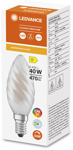 Dimmbare LED-Lampen, klassische Minikerzenform. Produkteigenschaften: LED-Lampen für Netzspannung. Ausstrahlungswinkel: bis zu 300°. Dimmbar. Farbwiedergabeindex Ra: ≥ 90. Produktvorteile: Lampen mit innovativer LED-"Filament"-Technologie. Design, Abmessungen, Lichtstrom vergleichbar mit einer Halogenlampe. Natürliches Lichtspektrum mit hervorragender Farbwiedergabe von CRI > 90. Stark reduzierter Blauanteil. Verbesserter Sehkomfort und geringere Augenbelastung. Sehr geringer Energieverbrauch. Sofort 100 % Licht, keine Aufwärmzeit. Geringes flackern. Anwendungsgebiete: Ideal für dekorative Einbauten. Anwendungen im Haushalt. Allgemeinbeleuchtung. Einsatz im Außenbereich nur in geeigneten Außenleuchten.