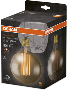 Dimmbare LED-Lampen, Vintage-Edition. Produkteigenschaften: LED-Lampen für Netzspannung. Lampe aus Glas. Lebensdauer: bis zu 15.000 h. Ausstrahlungswinkel: bis zu 360°. Dimmbar. Gute Lichtqualität; Farbwiedergabeindex Ra: ≥ 80; konstanter Farbort. Produktvorteile: Sehr geringer Energieverbrauch. Sofort 100 % Licht, keine Aufwärmzeit. Einfacher Austausch von Standardglühlampen. Lampen mit innovativer LED-"Filament"-Technologie. Anwendungsgebiete: Ideal für dekorative Einbauten. Anwendungen im Haushalt. Allgemeinbeleuchtung. Einsatz im Außenbereich nur in geeigneten Außenleuchten.