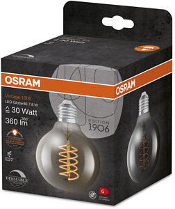 Dimmbare LED-Lampen, Vintage-Edition. Produkteigenschaften: LED-Lampen für Netzspannung. Lampe aus Glas. Lebensdauer: bis zu 15.000 h. Ausstrahlungswinkel: bis zu 360°. Dimmbar. Gute Lichtqualität; Farbwiedergabeindex Ra: ≥ 80; konstanter Farbort. Produktvorteile: Sehr geringer Energieverbrauch. Sofort 100 % Licht, keine Aufwärmzeit. Einfacher Austausch von Standardglühlampen. Lampen mit innovativer LED-"Filament"-Technologie. Anwendungsgebiete: Ideal für dekorative Einbauten. Anwendungen im Haushalt. Allgemeinbeleuchtung. Einsatz im Außenbereich nur in geeigneten Außenleuchten.