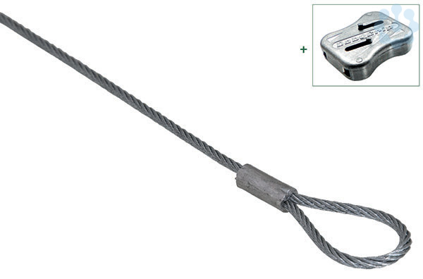 Die Schlaufe im DobyGrip-Drahtseil-Befestigungssystem, der Alternative zu Gewindestangen und Ketten mit kürzerer Montagezeit, aus elektrolytisch verzinktem 7x7 Litzenkabel wird mit einem DobyGrip-Schloss geliefert, Drahtstärke 2 Millimeter, Länge 2 Meter.