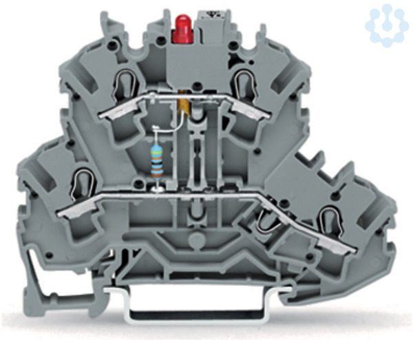 Bauelementklemme; Doppelstock; LED rot; DC 24 V; für Tragschiene 35 x 15 und 35 x 7,5; 2,5 mm²; Push-in CAGE CLAMP®; 2,50 mm²; grau