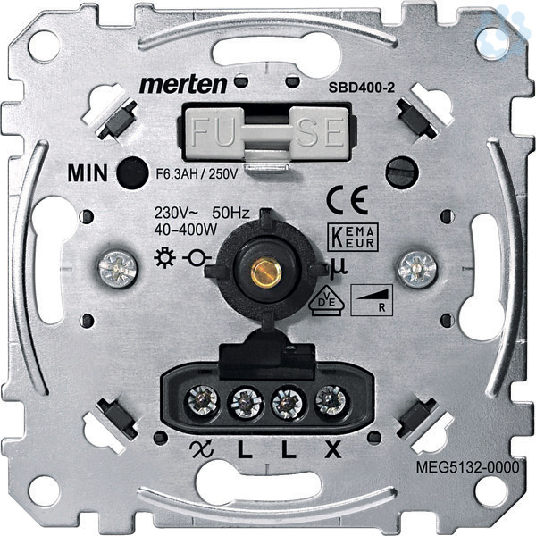 Für Glühlampen und 230 V-Halogenlampen. (Phasenanschnitt). Mit Druck-Wechselschalter. Zu komplettieren mit Zentralplatte mit Drehknopf System M MEG5250-03xx/-04xx/-06xx Zentralplatte mit transparenter Abdeckung und Drehknopf M-Creativ MEG5250-3500. Zentralplatte mit Drehknopf System Design MEG5250-60xx, System Fläche MEG5250-40xx/-41xx/-42xx Hinweis Informationen zum Thema Dimmen von LED Leuchtmittelnerhalten Sie im Internet unter Merten Dimmertest. http//www.merten.de/Dimmer-Test.dimmertest.0.html. Ausführung 40-400 W.