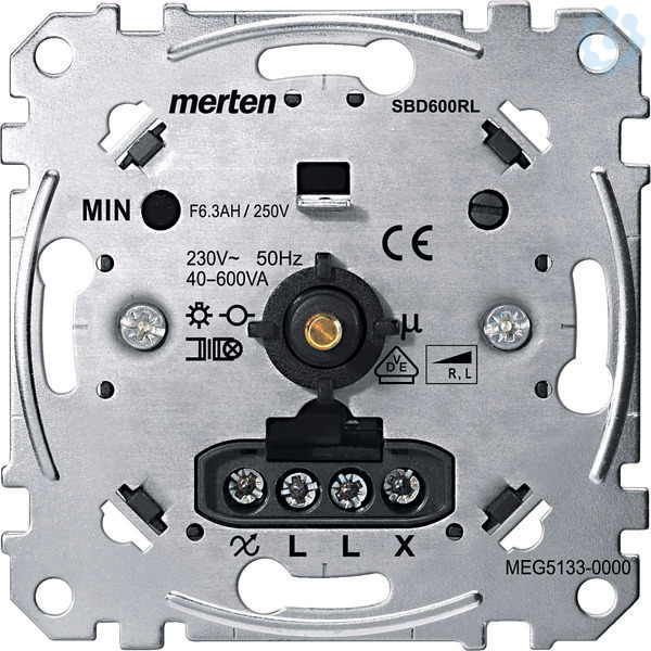 Für dimmbare, gewickelte Trafos, Glühlampen und 230 V-Halogenlampen (induktive/ohmsche Last). (Phasenanschnitt). Mit Druck-Wechselschalter. Zu komplettieren mit Zentralplatte mit Drehknopf System M MEG5250-03xx/-04xx/-06xx Zentralplatte mit transparenter Abdeckung und Drehknopf M-Creativ MEG5250-3500. Zentralplatte mit Drehknopf System Design MEG5250-60xx, System Fläche MEG5250-40xx/-41xx/-42xx Hinweis Informationen zum Thema Dimmen von LED Leuchtmittelnerhalten Sie im Internet unter Merten Dimmertest. http//www.merten.de/Dimmer-Test.dimmertest.0.html. Ausführung 40-600 W/VA.