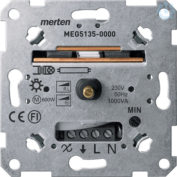 Für dimmbare, gewickelte Trafos, Glühlampen und 230 V-Halogenlampen (induktive/ohmsche Last). (Phasenanschnitt). Mit Druck-Ausschalter. Nennleistung 60-1000 VA. Motor Last 60-600 VA. Neutralleiter erforderlich. Zu komplettieren mit Zentralplatte mit Drehknopf System M MEG5250-03xx/-04xx/-06xx Zentralplatte mit transparenter Abdeckung und Drehknopf M-Creativ MEG5250-3500. Zentralplatte mit Drehknopf System Design MEG5250-60xx, System Fläche MEG5250-40xx/-41xx/-42xx Hinweis Informationen zum Thema Dimmen von LED Leuchtmittelnerhalten Sie im Internet unter Merten Dimmertest. http//www.merten.de/Dimmer-Test.dimmertest.0.html. Ausführung 60-1000 VA.
