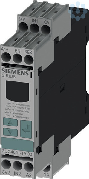 Digitales Überwachungsrelais Drehzahlüberwachung von 0.1 bis 2200 U/min Über- und Unterschreitung Versorgungsspannung: AC/DC 24 V DC und AC 50 bis 60 Hz ohne galvanische Trennung zum Messkreis Anlaufverzögerung 1 bis 900 s Auslöseverzögerung 0,1 bis 99,9 s Hysterese 0.1 bis 99 U/min 1 Wechsler mit oder ohne Fehlerspeicher Schraubanschluss Nachfolgeprodukt für 3UG3051 Digital einstellbares Drehzahlüberwachungsrelais SIRIUS 3UG4 für die Überwachung von Drehzahlen auf Über- und Unterschreitung, z. B. bei Schlupf oder Riss eines Riemenantriebes, geeignet auch für langsam drehende Motoren.Weltweiter Einsatz durch Weitspannungsversorgung und internationale Zertifikate. Schnelle Inbetriebnahme möglich durch menügeführte Parametrierung und Istwert-Anzeige zur Grenzwertbestimmung. Das Gerät verfügt über eine permanente Anzeige von Istwert oder Fehlerart. 2- oder 3-Leiter-Sensoren und Sensoren mit mechanischem Schalt- oder Elektronikausgang sind anschließbar. Hilfsspannung für Sensor ist integriert. Gerätewechsel möglich ohne Neuverdrahtung dank abnehmbarer Klemmen. Verlässliche Anlagendiagnose dank eindeutiger Fehlermeldungen am Display und zuschaltbarer Fehlerspeicher.Neben Schraubanschlusstechnik stehen die Geräte auch durchgängig mit Federzuganschluss für einen schnellen, wartungsfreien und rüttelsicheren Anschluss zur Verfügung. Sie sind wahlweise mit IO-Link erhältlich.Das umfassende Zubehör, wie z.B. Gerätekennzeichnungsschilder, Einstecklaschen und Abdeckkappen ist einheitlich für alle Relais.SIRIUS Relais - ein Programm für alle Fälle.