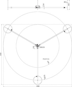 Dreibeinstativ zum freien Errichten von Stützrohren DEHNiso-Combi (D50 Länge 3200 mm). Zum Errichten mit Betonsockeln mit Keiltechnik, ohne zusätzliche Befestigung an Konstruktionselementen. Mit Anpassung an die Dachneigung bis max. 10°. Ausführung klappbar, speziell für die innenverlegte HVI Leitung im Stützrohr. Um den Biegeradius der HVI Leitung unten am Dreibeinstativ einzuhalten, werden zwei Betonsockel unterhalb des Schenkels und einer oberhalb positioniert.