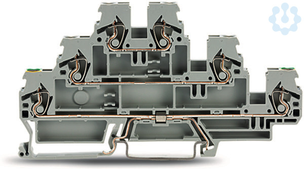 Dreistockklemme; Schutzleiter-/Durchgangs-/Durchgangsklemme; 2,5 mm²; PE/L/L; ohne Beschriftungsträger; für Tragschiene 35 x 15 und 35 x 7,5; CAGE CLAMP®; 2,50 mm²; grau