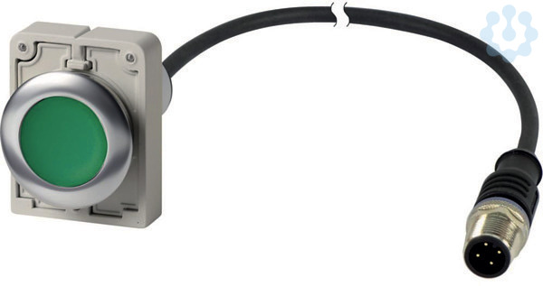 Drucktaste, RMQ compact solution, Komplettgerät, Bauform: flach, rastend, Anschlussart: Kabel (schwarz) mit M12A-Stecker, 4-polig, Kabellänge: 1 m, Tastenplatte: grün, Tastenplatte unbeschriftet, Beschriftung: ohne, Schutzart: IP66, IP67, IP69K (frontseitig), IP65 (rückseitig), Frontring Metall, Anbindung an SmartWire-DT: nein, S = Schließer: 1 S, Normen und Bestimmungen: IEC/EN 60947-5-1, VDE 0660