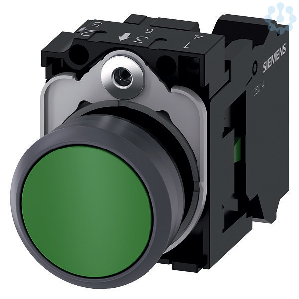 Drucktaster, 22 mm, rund, Kunststoff mit Metallfrontring, grün, Druckknopf, flach, tastend, mit Halter, 1S, Federzuganschluss Drucktaster SIRIUS ACT zur Schaltung und Steuerung elektrischer Verbraucher.Unter dem Markennamen SIRIUS ACT bietet Siemens ein einzigartiges Portfolio an Befehls- und Meldegeräten mit weltweiten Produkt-Zulassungen in vier modernen Designreihen aus robustem Echtmetall und hochwertigem Kunststoff.Das innovative Aufschnappkonzept vereinfacht die Montage so weit, dass dafür nur eine Hand und kein Spezialwerkzeug erforderlich ist. Als Montagebohrungen genügen nutfreie Löcher, da bereits ein 100%iger Verdrehschutz integriert ist.Dank der durchgängig hohen Schutzart sind die robusten Geräte industrietauglich und für den Außeneinsatz geeignet. Sogar die Reinigung mit Hochdruckstrahl ist möglich. Weder Staub, Öle noch aggressive Laugen können den zuverlässigen Betrieb stören.Neben der Standardverdrahtung können die Geräte auch über PROFINET, AS-Interface oder IO-Link an die Steuerung angebunden werden. Damit reduzieren Sie Ihren Verdrahtungsaufwand, minimieren Fehlerquellen und gewinnen mehr Flexibilität.Komfortabel unterstützt der grafische Online-Konfigurator bei Auswahl und Bestellung von Einzelgeräten, Gehäusen und Beschriftungen. Umfangreiche Dokumentation (z.B. Handbuch, 3D-Daten, Anschlussdiagramm) ist verfügbar.Lieferbare Ausführungen: mehrere Farben, beleuchtet/unbeleuchtet, mit/ohne Beschriftung, verrastende/tastende Betätigung, verschiedene Druckknopf- und Frontringhöhen.Hinweis: Komplettgerät, Lieferung inklusive Halter und Module.SIRIUS ACT - Performance in Action beim Befehlen und Melden. Einfach montiert, einfach stark, einfach perfekt.