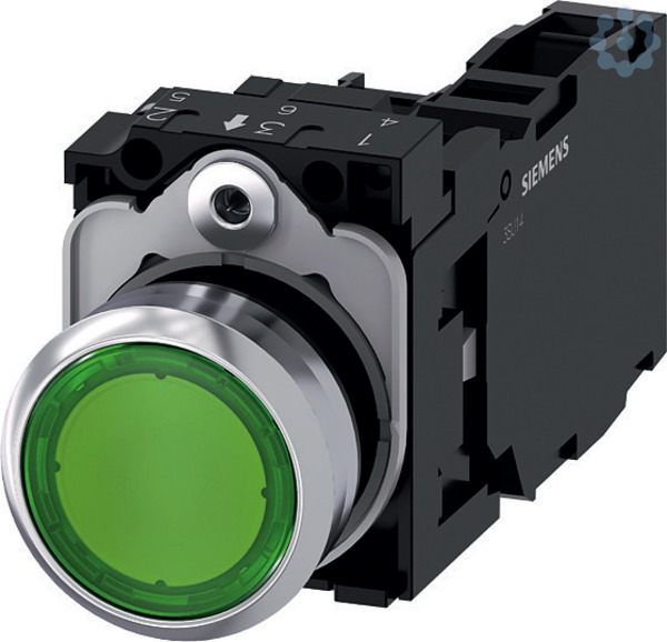 Leuchtdrucktaster, 22 mm, rund, Metall, hochglanz, grün, Druckknopf, flach, tastend, mit Halter, 1S+1Ö, LED-Modul mit integrierter LED AC 110 V, Schraubanschluss Leuchtdrucktaster SIRIUS ACT zur Schaltung und Steuerung elektrischer Verbraucher.Unter dem Markennamen SIRIUS ACT bietet Siemens ein einzigartiges Portfolio an Befehls- und Meldegeräten mit weltweiten Produkt-Zulassungen in drei modernen Designreihen aus robustem Echtmetall und hochwertigem Kunststoff.Das innovative Aufschnappkonzept vereinfacht die Montage so weit, dass dafür nur eine Hand und kein Spezialwerkzeug erforderlich ist. Als Montagebohrungen genügen nutfreie Löcher, da bereits ein 100%igerVerdrehschutz integriert ist.Dank der durchgängig hohen Schutzart sind die robusten Geräte industrietauglich und für den Außeneinsatz geeignet. Sogar die Reinigung mit Hochdruckstrahl ist möglich. Weder Staub, Öle noch aggressive Laugen können den zuverlässigen Betrieb stören.Neben der Standardverdrahtung können die meisten Geräte auch über PROFINET, AS-Interface oder IO-Link an die Steuerung angebunden werden. Damit reduzieren Sie Ihren Verdrahtungsaufwand, minimieren Fehlerquellen und gewinnen mehr Flexibilität.Komfortabel unterstützt der grafische Online-Konfigurator bei Auswahl und Bestellung von Einzelgeräten, Gehäusen und Beschriftungen. Umfangreiche Dokumentation (z.B. Handbuch, 3D-Daten, Anschlussdiagramm) ist verfügbar.Lieferbare Ausführungen: mehrere Farben, beleuchtet/unbeleuchtet, mit/ohne Beschriftung, verrastende/tastende Betätigung, verschiedene Druckknopf- und Frontringhöhen.Hinweis: Komplettgerät, Lieferung inklusive Halter und Module.SIRIUS ACT - Performance in Action beim Befehlen und Melden. Einfach montiert, einfach stark, einfach perfekt.