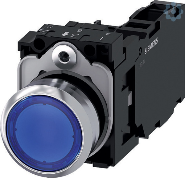 Leuchtdrucktaster, 22 mm, rund, Metall, hochglanz, blau, Druckknopf, flach, tastend, mit Halter, 1S+1Ö, LED-Modul mit integrierter LED AC 230 V, Schraubanschluss Leuchtdrucktaster SIRIUS ACT zur Schaltung und Steuerung elektrischer Verbraucher.Unter dem Markennamen SIRIUS ACT bietet Siemens ein einzigartiges Portfolio an Befehls- und Meldegeräten mit weltweiten Produkt-Zulassungen in drei modernen Designreihen aus robustem Echtmetall und hochwertigem Kunststoff.Das innovative Aufschnappkonzept vereinfacht die Montage so weit, dass dafür nur eine Hand und kein Spezialwerkzeug erforderlich ist. Als Montagebohrungen genügen nutfreie Löcher, da bereits ein 100%igerVerdrehschutz integriert ist.Dank der durchgängig hohen Schutzart sind die robusten Geräte industrietauglich und für den Außeneinsatz geeignet. Sogar die Reinigung mit Hochdruckstrahl ist möglich. Weder Staub, Öle noch aggressive Laugen können den zuverlässigen Betrieb stören.Neben der Standardverdrahtung können die meisten Geräte auch über PROFINET, AS-Interface oder IO-Link an die Steuerung angebunden werden. Damit reduzieren Sie Ihren Verdrahtungsaufwand, minimieren Fehlerquellen und gewinnen mehr Flexibilität.Komfortabel unterstützt der grafische Online-Konfigurator bei Auswahl und Bestellung von Einzelgeräten, Gehäusen und Beschriftungen. Umfangreiche Dokumentation (z.B. Handbuch, 3D-Daten, Anschlussdiagramm) ist verfügbar.Lieferbare Ausführungen: mehrere Farben, beleuchtet/unbeleuchtet, mit/ohne Beschriftung, verrastende/tastende Betätigung, verschiedene Druckknopf- und Frontringhöhen.Hinweis: Komplettgerät, Lieferung inklusive Halter und Module.SIRIUS ACT - Performance in Action beim Befehlen und Melden. Einfach montiert, einfach stark, einfach perfekt.