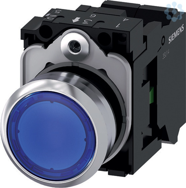 Leuchtdrucktaster, 22 mm, rund, Metall, hochglanz, blau, Druckknopf, flach, tastend, mit Halter, 1S, LED-Modul mit integrierter LED AC 230 V, Federzuganschluss Leuchtdrucktaster SIRIUS ACT zur Schaltung und Steuerung elektrischer Verbraucher.Unter dem Markennamen SIRIUS ACT bietet Siemens ein einzigartiges Portfolio an Befehls- und Meldegeräten mit weltweiten Produkt-Zulassungen in drei modernen Designreihen aus robustem Echtmetall und hochwertigem Kunststoff.Das innovative Aufschnappkonzept vereinfacht die Montage so weit, dass dafür nur eine Hand und kein Spezialwerkzeug erforderlich ist. Als Montagebohrungen genügen nutfreie Löcher, da bereits ein 100%igerVerdrehschutz integriert ist.Dank der durchgängig hohen Schutzart sind die robusten Geräte industrietauglich und für den Außeneinsatz geeignet. Sogar die Reinigung mit Hochdruckstrahl ist möglich. Weder Staub, Öle noch aggressive Laugen können den zuverlässigen Betrieb stören.Neben der Standardverdrahtung können die meisten Geräte auch über PROFINET, AS-Interface oder IO-Link an die Steuerung angebunden werden. Damit reduzieren Sie Ihren Verdrahtungsaufwand, minimieren Fehlerquellen und gewinnen mehr Flexibilität.Komfortabel unterstützt der grafische Online-Konfigurator bei Auswahl und Bestellung von Einzelgeräten, Gehäusen und Beschriftungen. Umfangreiche Dokumentation (z.B. Handbuch, 3D-Daten, Anschlussdiagramm) ist verfügbar.Lieferbare Ausführungen: mehrere Farben, beleuchtet/unbeleuchtet, mit/ohne Beschriftung, verrastende/tastende Betätigung, verschiedene Druckknopf- und Frontringhöhen.Hinweis: Komplettgerät, Lieferung inklusive Halter und Module.SIRIUS ACT - Performance in Action beim Befehlen und Melden. Einfach montiert, einfach stark, einfach perfekt.