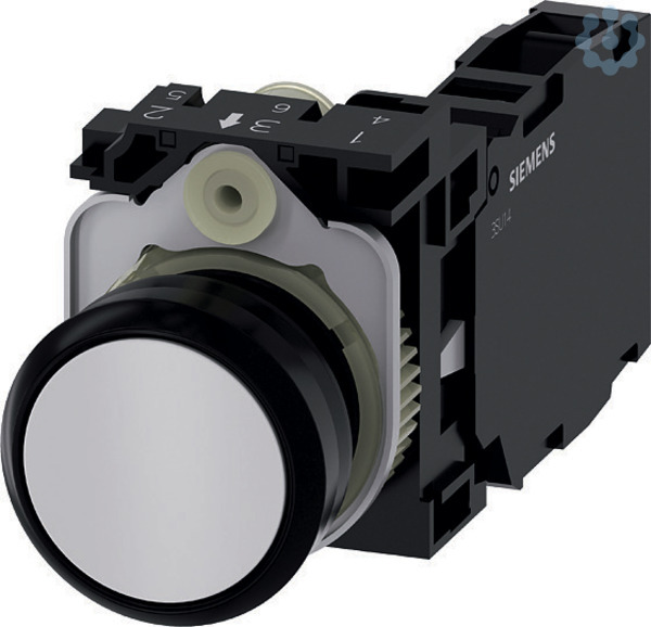 Drucktaster, 22 mm, rund, Kunststoff, weiß, Druckknopf, flach, tastend, mit Halter 1S+1Ö, Schraubanschluss, Drucktaster SIRIUS ACT zur Schaltung und Steuerung elektrischer Verbraucher.Unter dem Markennamen SIRIUS ACT bietet Siemens ein einzigartiges Portfolio an Befehls- und Meldegeräten mit weltweiten Produkt-Zulassungen in drei modernen Designreihen aus robustem Echtmetall und hochwertigem Kunststoff.Das innovative Aufschnappkonzept vereinfacht die Montage so weit, dass dafür nur eine Hand und kein Spezialwerkzeug erforderlich ist. Als Montagebohrungen genügen nutfreie Löcher, da bereits ein 100%iger Verdrehschutz integriert ist.Dank der durchgängig hohen Schutzart sind die robusten Geräte industrietauglich und für den Außeneinsatz geeignet. Sogar die Reinigung mit Hochdruckstrahl ist möglich. Weder Staub, Öle noch aggressive Laugen können den zuverlässigen Betrieb stören.Neben der Standardverdrahtung können die meisten Geräte auch über PROFINET, AS-Interface oder IO-Link an die Steuerung angebunden werden. Damit reduzieren Sie Ihren Verdrahtungsaufwand, minimieren Fehlerquellen und gewinnen mehr Flexibilität.Komfortabel unterstützt der grafische Online-Konfigurator bei Auswahl und Bestellung von Einzelgeräten, Gehäusen und Beschriftungen. Umfangreiche Dokumentation (z.B. Handbuch, 3D-Daten, Anschlussdiagramm) ist verfügbar.Lieferbare Ausführungen: mehrere Farben, beleuchtet/unbeleuchtet, mit/ohne Beschriftung, verrastende/tastende Betätigung, verschiedene Druckknopf- und Frontringhöhen.Hinweis: Komplettgerät, Lieferung inklusive Halter und Module.SIRIUS ACT - Performance in Action beim Befehlen und Melden. Einfach montiert, einfach stark, einfach perfekt.