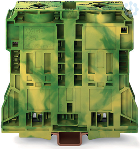 2-Leiter-Schutzleiterklemme; 120 mm²; seitliche Beschriftungsaufnahmen; nur auf Tragschiene 35 x 15; 2,3 mm dick; Kupfer; POWER CAGE CLAMP; 120,00 mm²; grün-gelb