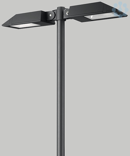 BEGA Aufsatzleuchte 84124K4 in 2-fach-Anordnung. Asymmetrisch-bandförmige Lichtstärkeverteilung. Lichtlenkung durch alterungsbeständiges, polymerfreies optisches System. LED 26 W Leuchten-Anschlussleistung, Leuchten-Lichtstrom 3533 lm, Farbtemperatur 4000 K. Farbwiedergabeindex (CRI) > 80 je Leuchtenkörper. Mit austauschbaren BEGA LED-Modulen mit Übertemperaturschutz und einer Lebenserwartung von mindestens 50.000 Betriebsstunden. 20-jährige Nachliefergarantie auf LED-Module und Verschleißteile. Mit 2 LED-Netzteilen, DALI steuerbar, 220-240 V, 0/50-60 Hz. Schutzart IP 66. Leuchte aus Aluminiumguss, Aluminium und Edelstahl. Beschichtungstechnologie BEGA Unidure® , Farbe Grafit. Sicherheitsgläser entspiegelt. Reflektoren aus eloxiertem Reinstaluminium. Werkzeugloser Verschluss. Anstellwinkel in 10°-Stufen bis +90° einstellbar. Mit zwei fest angeschlossenen Anschlussleitungen X05BQ-F 5 G 1 qmm, Länge 6 m. Mastzopfdurchmesser 76 mm, Einstecktiefe 90 mm. Abmessungen: 290 x 110 x 1200 mm. Für Lichtpunkthöhen von 4000 - 6000 mm.