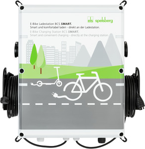 E-Bike Ladestation, überwachtes und kontrolliertes Laden für den E-Biker und Betreiber der Ladestation, Cloud-Anbindung über LAN, WLAN oder Mobilfunk, grau, ähnlich RAL 7035, mit bedrucktem Deckel, mit fest montiertem Kabelsystem (2,5 m), inkl. Statusanzeige der einzelnen Ladepunkte, anschließbar an das 230/400V-Netz, Produkt wird anschlussfertig geliefert für eine schnelle und einfache Wandmontage. Zur Verwendung mit dem BCS Managementportal (inkl. zwei Jahre Nutzungslizenz bei Erwerb). Nach Ablauf der vereinbarten Nutzungsdauer des Management Portals fallen evtl. weitere Nutzungsgebühren an. Es gelten die aktuellen Nutzungsbedingungen). Die Nutzung der smarten Dienste setzt die Akzeptanz der aktuellen Nutzungsbedingungen voraus-einzusehen unter www.spelsberg.de/bcs/nutzungsbedingungen. Wiederverkäufer sind verpflichtet, Ihren Kunden auf diese Regelung hinzuweisen., vier Ladepunkte, davon 2 x Steckdose Schuko 230V, 2 x Bosch Standard Charger 4A