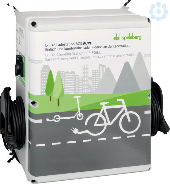 E-Bike Ladestation, überwachtes und kontrolliertes Laden für den E-Biker und Betreiber der Ladestation, grau, ähnlich RAL 7035, mit bedrucktem Deckel, mit fest montiertem Kabelsystem (2,5m), inkl. Statusanzeige der einzelnen Ladepunkte, anschließbar an das 230/400V-Netz, Produkt wird anschlussfertig geliefert für eine schnelle und einfache Wandmontage, vier Ladepunkte, davon 2 x Bosch Standard Charger 4A, 2 x SCHUKO(R) 230V