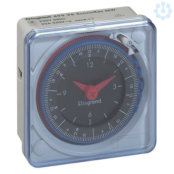Legrand EconoRex MW, analoge Wochenzeitschaltuhr mit Synchronmotor (netzsynchrone Ganggenauigkeit) für Fronttafeleinbau und Wandmontage, 1 Kanal, Betriebsspannung 230 V 50 Hz. Flachsteckeranschluss, Zeiger vorwärts und rückwärts drehbar, dadurch leichte Umstellung (z.B. Sommer-/Winterzeit), Tagesscheibe mit unverlierbaren Segmenten, kürzeste Schaltzeit 2 Std., Wandmontage mittes Wandhalterung Best.-Nr. 049594 optional, Abmessung (HxB): 72 x 72 mm, Schaltausgang: 1 Wechsler.