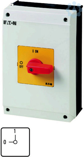 EIN-AUS-Schalter, Sortiment: EIN-AUS-Schalter, Typkenner: P3, STOPP-Funktion: NOT-AUS-Funktion, mit rotem Knebel und gelbem Frontschild, Information zum Lieferumfang: Hilfsschalterkontakt oder Neutralleiter nachrüstbar., 3-polig, Schutzart: IP65, Bauform: Aufbau, Bemessungsbetriebsleistung AC-23A, 50 - 60 Hz 400 V: P = 30 kW, Bemessungsdauerstrom: Iu = 63 A, Normen und Bestimmungen: IEC/EN 60947, VDE 0660, IEC/EN 60204, CSA, UL, Lasttrennschalter nach IEC/EN 60947-3