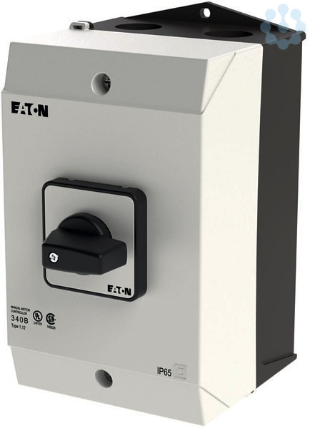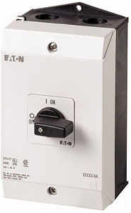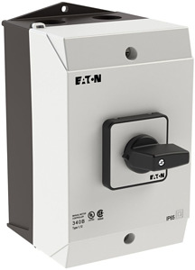 EIN-AUS-Schalter, Sortiment: EIN-AUS-Schalter, Typkenner: T3, mit schwarzem Knebel und Frontschild, Hinweis: UL/CSA, 7-polig, Schutzart: IP65, Bauform: Aufbau, Schaltwinkel: 90 °, Schaltverhalten: rastend, Frontschild: 0-1, Bemessungsbetriebsleistung AC-23A, 50 - 60 Hz 400 V: P = 15 kW, Bemessungsdauerstrom: Iu = 32 A, 4 Baueinheit(en), Normen und Bestimmungen: IEC/EN 60947, VDE 0660, IEC/EN 60204, CSA, UL, Lasttrennschalter nach IEC/EN 60947-3