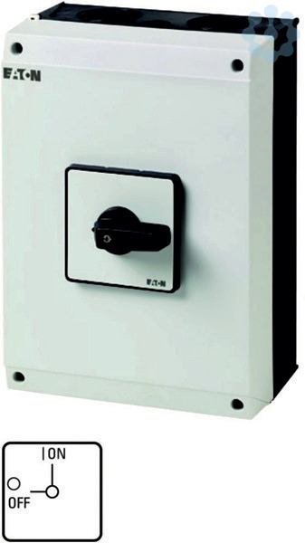 EIN-AUS-Schalter, Sortiment: EIN-AUS-Schalter, Typkenner: T5, mit schwarzem Knebel und Frontschild, 6-polig, Schutzart: IP65, Bauform: Aufbau, Schaltwinkel: 90 °, Schaltverhalten: rastend, Frontschild: 0-1, Bemessungsbetriebsleistung AC-23A, 50 - 60 Hz 400 V: P = 55 kW, Bemessungsdauerstrom: Iu = 100 A, 3 Baueinheit(en), Normen und Bestimmungen: IEC/EN 60947, VDE 0660, IEC/EN 60204, Lasttrennschalter nach IEC/EN 60947-3