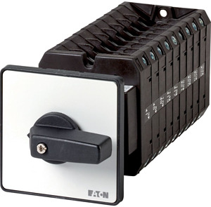 EIN-AUS-Schalter, Sortiment: EIN-AUS-Schalter, Typkenner: T5, mit schwarzem Knebel und Frontschild, 18-polig, Schutzart: Front IP65, Bauform: Zwischenbau, Schaltwinkel: 90 °, Schaltverhalten: rastend, Frontschild: 0-1, Bemessungsbetriebsleistung AC-23A, 50 - 60 Hz 400 V: P = 55 kW, Bemessungsdauerstrom: Iu = 100 A, 9 Baueinheit(en), Normen und Bestimmungen: IEC/EN 60947, VDE 0660, IEC/EN 60204, Lasttrennschalter nach IEC/EN 60947-3
