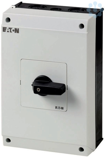 EIN-AUS-Schalter, Sortiment: EIN-AUS-Schalter, Typkenner: T5B, mit schwarzem Knebel und Frontschild, 8-polig, Schutzart: IP65, Bauform: Aufbau, Schaltwinkel: 90 °, Schaltverhalten: rastend, Frontschild: 0-1, Bemessungsbetriebsleistung AC-23A, 50 - 60 Hz 400 V: P = 30 kW, Bemessungsdauerstrom: Iu = 63 A, 4 Baueinheit(en), Normen und Bestimmungen: IEC/EN 60947, VDE 0660, IEC/EN 60204, CSA, UL, Lasttrennschalter nach IEC/EN 60947-3