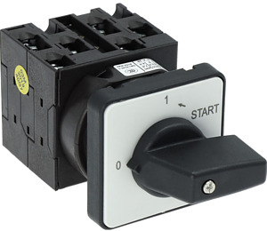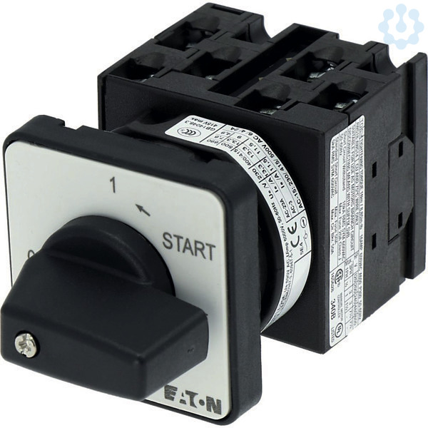 EIN-AUS-Taster, Sortiment: Steuerschalter, Normen und Bestimmungen: IEC/EN 60947, VDE 0660, IEC/EN 60204, CSA, UL, Lasttrennschalter nach IEC/EN 60947-3, Typkenner: T0, mit schwarzem Knebel und Frontschild, Kontakte: 6, Tastfunktion: Tastfunktion in Stellung START, Schutzart: Front IP65, Bauform: Einbau, Schaltwinkel: 90 °, Schaltverhalten: rastend, mit 0-Stellung, mit Rückzug nach 1, 3 Baueinheit(en), Bemessungsdauerstrom: Iu= 20 A, Frontschild: 0-1<START