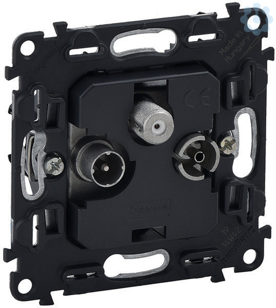 Valena In’Matic, TV-R-SAT Durchgangsdose, Antennendosen zur IN/OUT-Verkabelung (Enddosen am Ende der Leitung notwendig). Anschlussdämpfung: 14 dB. Durchgangsdämpfung: 1,5 dB. Schnellanschlusstechnik mit ¼-Drehung. Frequenzband: TV: 5 – 68 und 120 - 862 MHz. R: 87,5 – 108 MHz. SAT: 950 – 2400 MHz.