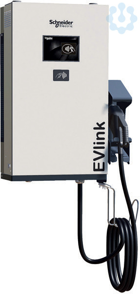 EVlink Wallbox DC 24 kW mit Kabel CCS2. Wand-Ladestation - zur DC-Ladung von Elektrofahrzeugen in Mode 4. 1 Ladepunkt, Kabel 3,5 m, Ladeleistung: 24 kW (DC), Typ CCS2. Mit 7-Zoll farbigem Touch Display zur Bedienung inkl. verschiedener Sprachen. OCPP 1.6 Kommunikation zu einem Backend-System über LAN/TCP/IP oder 3G Modem. Für private und halböffentliche Anwendungen. Für den innen- oder Außenbereich (IP54). Zugrifsskontrolle mit RFID. Abmessungen (H x L x B): 860 x 507 x 250 mm (Wandmontage), 1533 x 536 x 321 mm (Montage auf Stele EVP1DB1LG). Gewicht: 66 kg (Wandmontage), 117 kg (Montage auf Stele). Eingang: 380-480VAC, 50-60Hz, In: 37A. Ausgang: 150-530VDC, In: 1,5-65A, Pmax: 24kW. CE, IEC-EN 61851-1 / 61851-22 / 61851-21-2, RoHS, REACH-SVHC, IEC 61557-1 & IEC 61557-8.