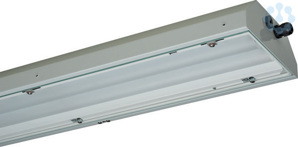 EX-LED-Stahlblechleuchte, EX-Zone 1/21/2/22, 40 W, 5600 lm, SKI, IP65, breitstrahlend, 6500 K, Ra≥ 80, Ta -30 °C/+55 °C, L80B50>100000 h (@ Ta max), L80B50>100000 h (@ Ta 25°C), L90B50>80000 h (@ Ta 25°C), Scheibe Sicherheitsglas klar, Verschluss Edelstahl (1.4305), Gehäuse Stahl, Lackiert, Farbe grau, RAL 7035, Durchgangsverdrahtung (DV) 5x2,5 mm² PVC, Rein-Raus-Verdrahtung (RR), LABS-getestet nach VDMA 24364-C2-L, EAN/GTIN:4041254346243.Explosionsgeschützte LED-Steildachleuchte für Zone 1/21. Stahlblechgehäuse lichtgrau pulverlackiert (RAL 7035), rahmenloses scharniertes Sicherheitsglas, abklappbar, Zentralverschluss mit gegenüberliegenden Innenscharnieren, Silikondichtung. Reflektor aus Stahlblech weiß lackiert, abklapp- und aushängbar, mit vergossenen LED Modulen und Entblendungselementen. Gekapseltes EVG mit Überspannungs-, Überlast- und Kurzschlussschutz.