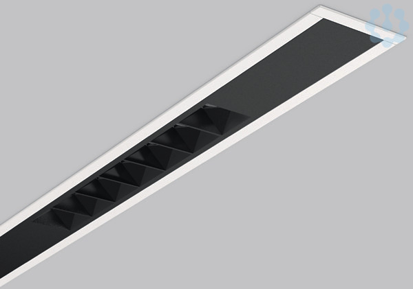 Lineare Decken- und Wandeinbauleuchte für ästhetisch anspruchsvolle Beleuchtung. Leuchte mit 2 LED-Lichteinheiten. Gehäuse Aluminium-Strangpressprofil pulverbeschichtet. Endkappen Aluminium pulverbeschichtet. LED-Lichteinheit mit MRS-Technologie: Mini-Reflektor-System aus metallisiertem Thermoplast mit prismenförmigen schwarzen Entblendungsrahmen für angenehm blendfreies Licht (UGR < 10). 7 Reflektorelemente pro LED-Lichteinheit. Lichtverteilung mittelbreit-strahlend.. Deckenbefestigung mit vormontiertem SBS-Montagesystem. Austauschbare und herausnehmbare LED-Einheit mit integriertem Betriebsgerät. Für Durchgangsverdrahtung geeignet.